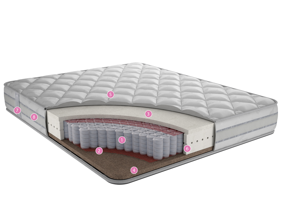 Матрас Плато Д1 наполнен экологически чистыми материалами: объемным нетканым холлофайбером и латексированным кокосовым волокном, придающими изделию дополнительную жесткость и воздухопроницаемость. Кокосовое волокно усиливает ортопедический эффект, а холлофайбер отвечает за мягкость и гигиеничность поверхности. Стеганое тканевое покрытие гарантирует приятные тактильные ощущения и долговечность ткани, а защитный экран предотвращает повреждение пружин и продлевает срок службы матраса.
